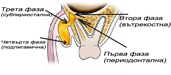 II фаза (вътрекостна): Възпалението е в костта, около корена на зъба.